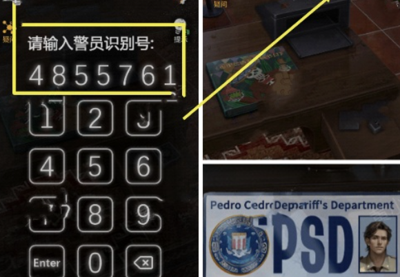 17、点击查看柜子里的丹尼尔的探员证件、柜子里的挪车号码牌,获得线索丹尼尔的警号:4855761、丹尼尔的号码(2137131228)。