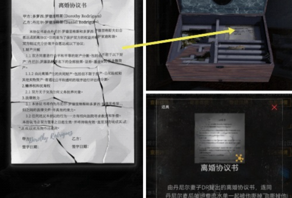 9、点击盒子里面的文件,完成拼图,获得线索离婚协议书和盒子里的钥匙。