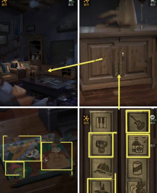 16、在丹尼尔家客厅中点击电视柜左侧柜门上的密码锁,根据《布里兰迪亚传统节日》的线索,依次按下乐器、帽子、龙舌兰、骨头按钮。