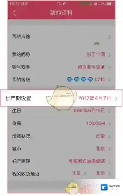 1、在“我”的界面中,点击“个人头像”,在“我的资料”界面中,选择“预产期设置”