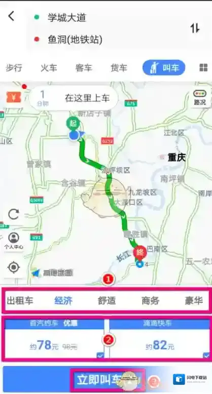 填写好目的地之后,就会转到如图所示的页面,在图示区域1中可以选择叫车的类型。在区域2中显示的是当前能够约到的网约车类型以及价格(系统默认的是都会勾选,如果你想取消某一种那么就点击对应的网约车公司一下),设置好之后,点击图示3的立即叫车,稍微等待一会儿就会有司机接单了,接完单司机就会与你联系,并来接驾。
