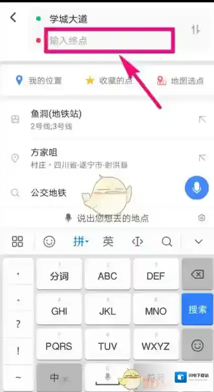 软件自动跳转到目的地输入页面(起始位置是地图根据你当前所处的位置进行自动定位的,如果定位不准可以手动输入),在图示位置手动输入你要去往的目的地。