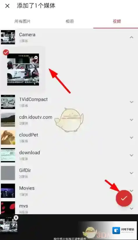2、接下来用户们需要从中选择好要编辑的视频,点击右下角对勾选项进入视频编辑页面,进行操作设置。