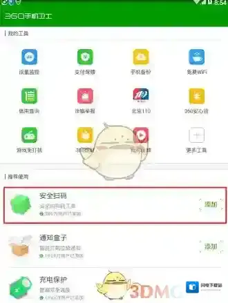 2、在360手机卫士的“工具箱”界面中,在“推荐实用”一栏中,找到“安全扫码”一项,点击右侧的“添加”按钮
