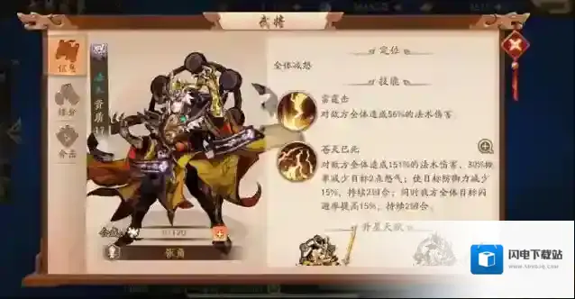 首先给大家介绍下少三2里左慈的技能,他属于群雄阵营,主要在队伍里的站位就是在后排,总共拥有两个技能,其一技能叫做神通术,使用后就可以直接对敌方后排武将造成百分之九十的法伤。其二技能叫做万象雷劫,当左慈使用该技能后就会对着敌方后排造成百分之两百多的法伤。同时该技能还会在两回合的持续时间内,让我方所有角色都增加百分之十的闪避,并且还会有百分之三十的概率,让左慈拥有化身的效果,该效果就会让该武将出现变猪的效果,该化身虽然看起来有些奇怪,却是十分强的。在该武将处于野猪状态之时,普通攻击就能够对敌方一列的角色造成百分之五十的物伤。