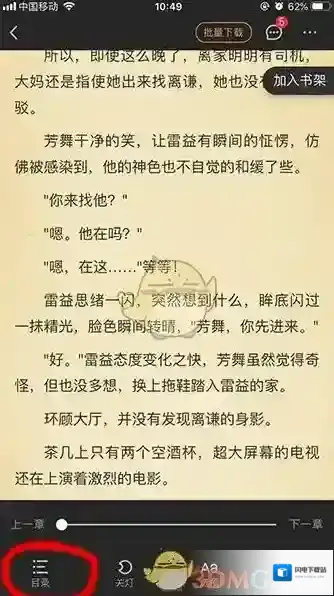 2、进入阅读小说内容的时候,点击一下屏幕,然后在左下角就可以看到目录了。点击目录,即可进入书籍的目录列表。