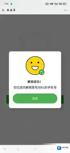 4、然后会弹出一个提示窗口,在确定解绑之后,将无法接收到来自微信服务号的快件通知,点击解绑,在弹出解绑成功的提示之后,表示我们已经成功解除微信手机号码绑定了。