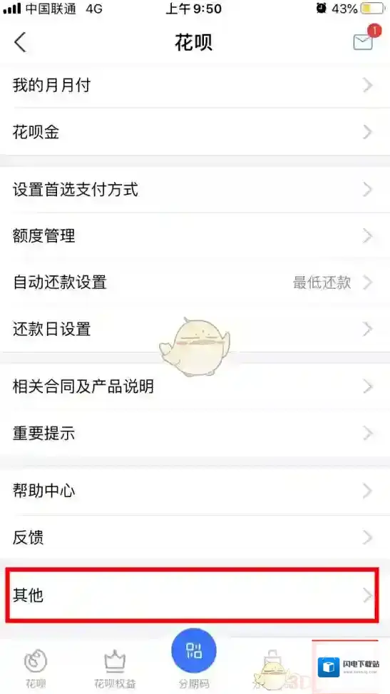 1、打开支付宝,点击我的-花呗,在花呗界面点击我的,下拉到最下面点击其它。