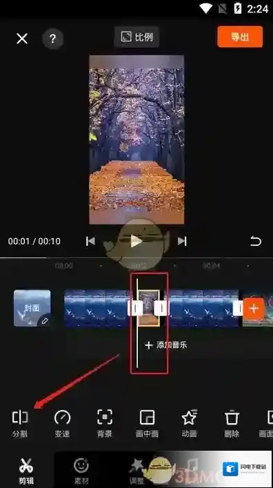 3、进入视频剪辑之后,拉动视频时间轴,找到需要删除的视频片段位置,将其拉到白色视频线下,点击分割;
