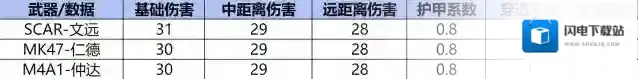 我们在伤害对比中也能看出来,SCAR-文远的伤害要高于其他两款武器,MK47-仁德和M4A1-仲达除了伤害比SCAR-文远少了一些外,其他的伤害数据和SCAR-文远一致的,但是这一点基础伤害的提升也让SCAR-文远无论中远距离都可以做到爆头一枪带走敌人。而在护甲系数、穿透层数和穿透系数上三款武器都是一致的。