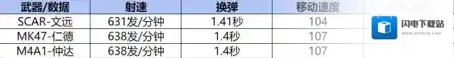 数据对比我们从性能对比可以看出来,SCAR-文远在射速和移速上要略逊于其他两款武器,除此之外在换弹和切枪速度上,三款武器的属性一致。整体来说差距不算太大,是在正常可以接受的范围内。