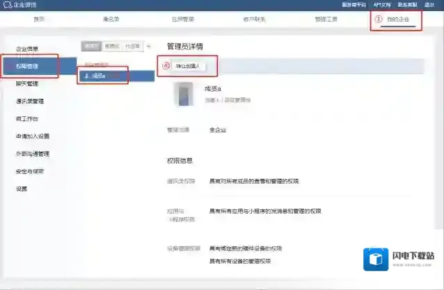 方法1:登录企业微信管理后台,在“我的企业-权限管理”处转让创建人。