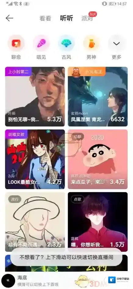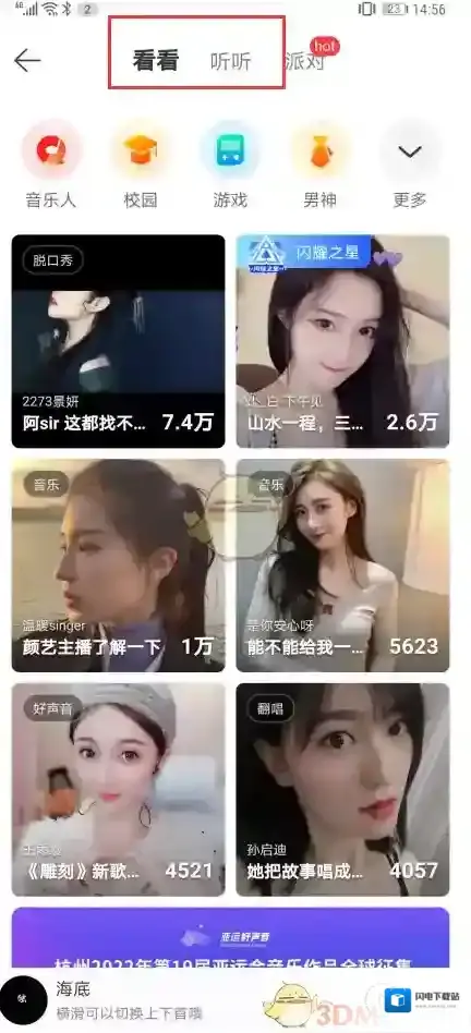 3、进入之后有看看,听听和派对,看看就是视频直播,听听就是音频直播。