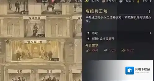 3、城堡科技解锁“高级兵工坊”,即可解锁四级城堡兵种,比一般兵营兵种要高一个档次。