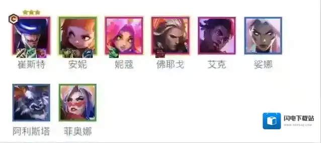 另一套推荐阵容是422卡牌,阵容构成为:火女、剑姬、琴女、牛头、佛耶戈、卡牌、妮寇和艾克。这套阵容的强度基本上都比较均衡,在从前期到后期强度都比较平滑,其中一个原因就是队内能出伤的角色多,且多以4费卡为主。特别在新版本中卡牌大师的技能更改后,他的主要伤害来源就变成了普通攻击,在拿到电刀后能够给队伍增加不少的增益。422卡牌高坦度的特性也决定了它前期的稳固运营优势,安妮这张卡的护盾量极高,且安妮自身同时带有福牛和灵能两个羁绊,而在版本更新后,福牛羁绊已经从提供移速变为增加双抗了,进一步提高了她的坦度。在面对前期大家普遍伤害低且坦度低的情况下,这套阵容吃的就是前期强度的红利。