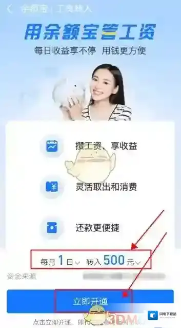 4、设置转入的日期和金额,如每月1号转入500元,再点击下方的立即开通。