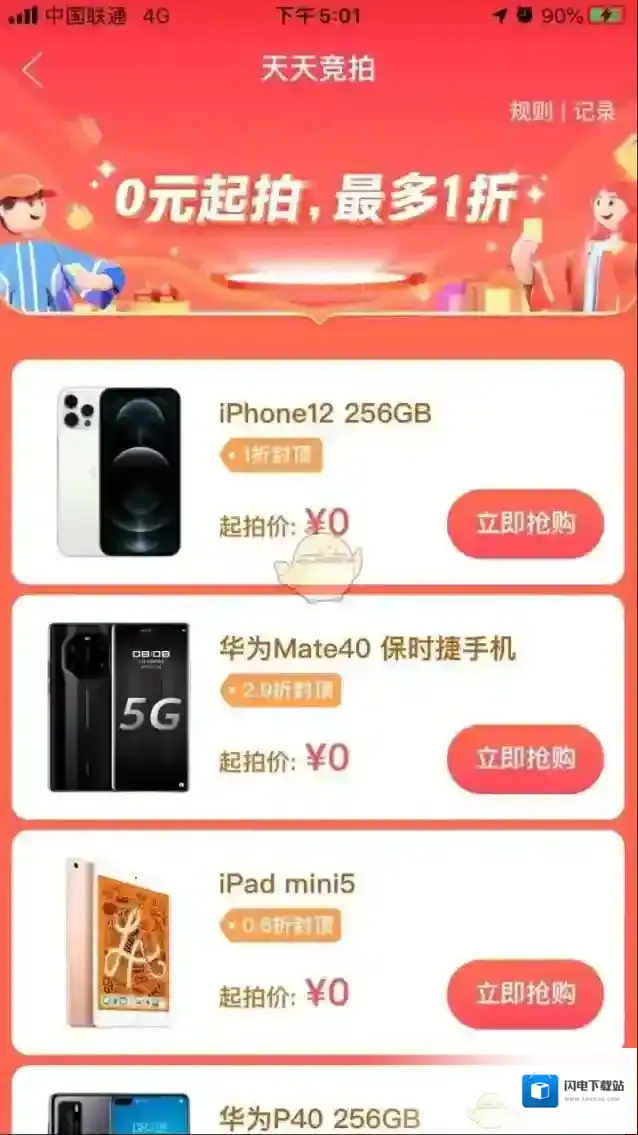 2、进入天天竞拍后,可以看到有很多商品都是0元起拍的,这个就是几个人同时买一件商品,谁出价高归谁,最后拍下的人获胜。