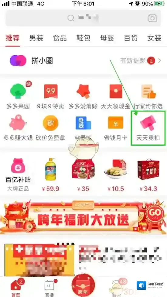 1、将拼多多更新到最新版本后,在首页滑动找到最后面的“天天竞拍”活动进入,如下图: