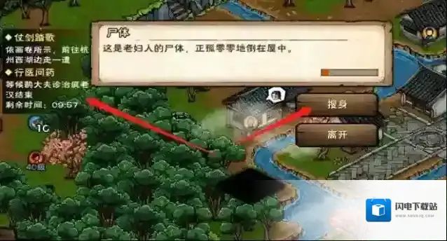 4、触发战斗后和鹊乐医战胜疯老汉,疯老汉没什么战斗力,随便把他打晕就行,然后鹊乐医开始医治疯老汉,需要等待10分钟,这时玩家可以搜查老妇人的尸体,获得铜钱×150、桂花糕×1。
