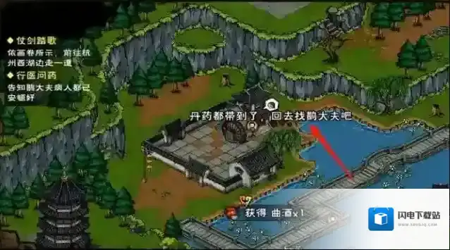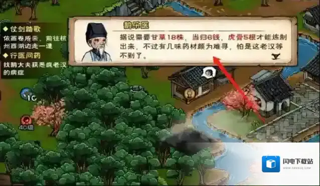 2、然后按鹊乐医的要求给龙井村(17,32)的农妇送去甘草汤,获得500阅历;给曲院(6,13)的曲老送去跌打药,获得曲酒×1和1000阅历;以及给河坊街(27,22)的卖鱼小贩送去解毒丹,获得鲤鱼×1,三个送药任务完成后就可以回宝安药堂找鹊乐医。