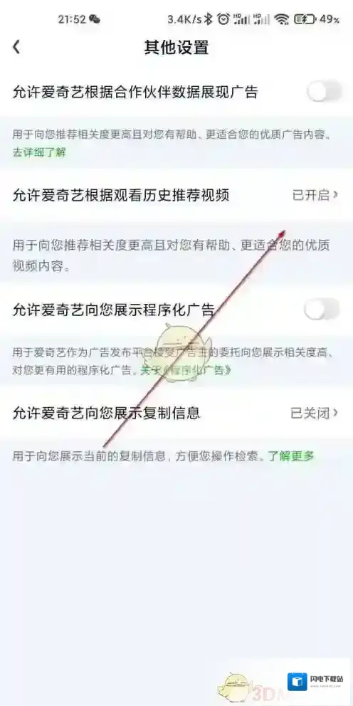 《爱奇艺》根据观看历史推荐视频关闭方法