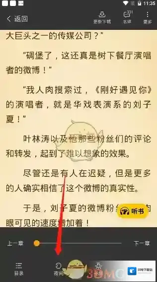 3、在下方就能够看见“夜间”的功能,点击后阅读界面背景就会变成黑色。