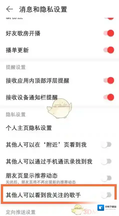 3、关闭其他人可以看到我关注的歌手右侧的开关即可。