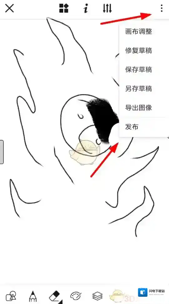 2、在作品编辑完毕之后,用户需要通过右上角的按钮唤起列表,从中选择“发布”按钮进行上传。