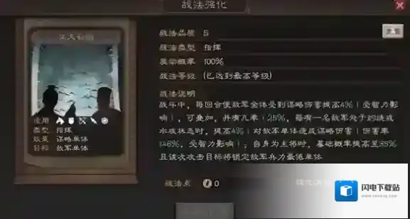 指挥战法,每回合使敌军全体受到的谋略伤害提高4%,并且有概率(每有一名敌军处于灼烧或水攻状态时提高4%)对敌方单体造成谋略伤害,当自身为主将时江天长焰的基础概率提升且谋略伤害将锁定敌方兵力最低武将。