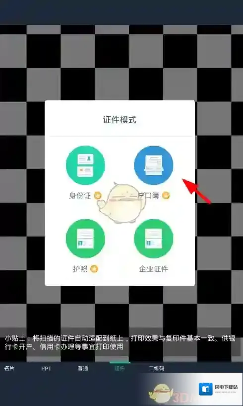 2、在此之后,用户需要在扫描拍摄页面里点击下方的“证件”选项,然后在上方出现的菜单里选择“户口簿”的证件模式,这样一来就可以成功的扫描户口本的具体信息了。