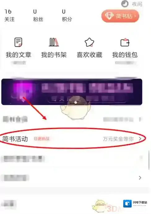 1、对于“日更挑战”感兴趣的用户,需要先点击页面右下角的按钮打开个人中心,然后选择下方列表里的“简书活动”功能。