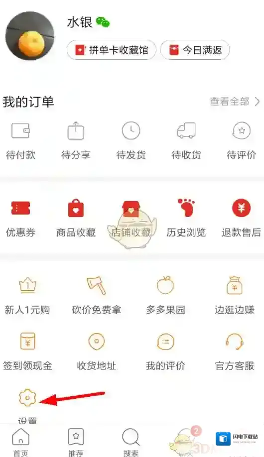 1、大家要想给拼多多设置免密码支付,那就需要先点击右下角进入个人中心,并且从下方的列表里选择“设置”功能进行操作。