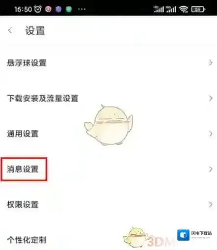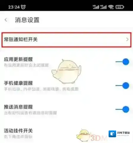 4、在消息设置页面处,点击红色方框“常驻通知栏开关”项。{如下图所示}