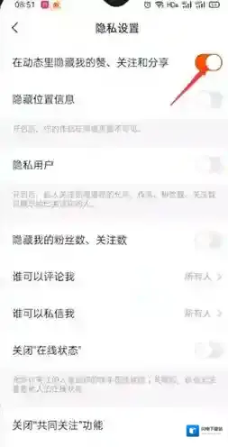 4、在隐私设置的最前面就是在动态里隐藏我的赞、关注和分享,向左滑动滑块关闭即可。