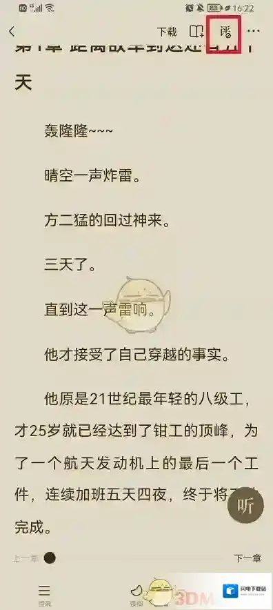 2、在小说阅读界面中,我们需要点击屏幕中间,然后唤出小说阅读设置,然后点击右上角评点击打开评论;