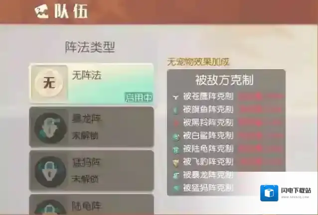 猛犸阵比较克制陆龟阵,但是也会被暴龙阵等克制;陆龟阵可以克制飞豹阵,也会被暴龙阵,猛犸阵克制;飞豹阵克制黑羚阵,被陆龟阵,暴龙阵克制。不过虽然阵法会有一些克制,但是最重要的还是团队的整体实力。