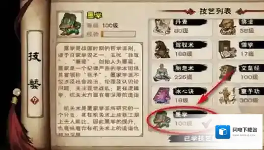 1、玩家想要学会机关术,首先需要把墨学升到100级。