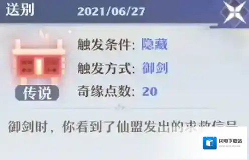 通过御剑触发送别,这是一个系列奇缘,首先你要通过采集触发劫富济贫,然后再通过采集触发埋伏,然后通过御剑触发送别,在后面有个选项最好选别拿走钱袋,里面其实是没钱的,然后会给你奖励,但是结局是个悲剧,最后你看到燕子李三被魔道报复杀死,替他复仇,痛失好友。