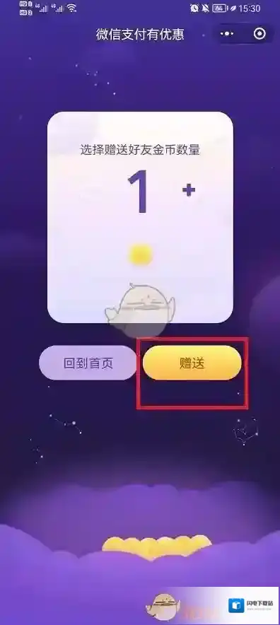 3、然后就把手机正常拿着,等金币不再晃动,我们就可以看到界面中出现了赠送好友金币数量选项赠送你想要赠送的数量即可,点击赠送就会回来微信聊天界面,选择想要赠送的好友即可。