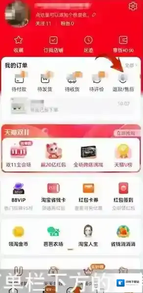 1、打开淘宝,然后点击右下角的我的淘宝图标,点击我的订单栏下方的退款/售后图标,