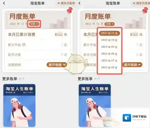4、点击右上角的月度账单,查看切换需要查看的月份即可查看消费账单。