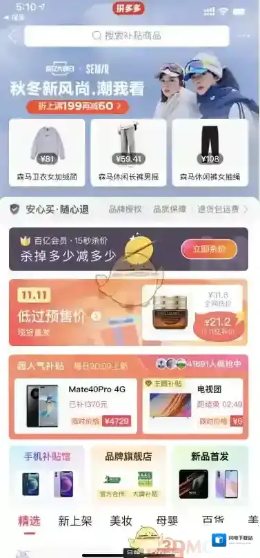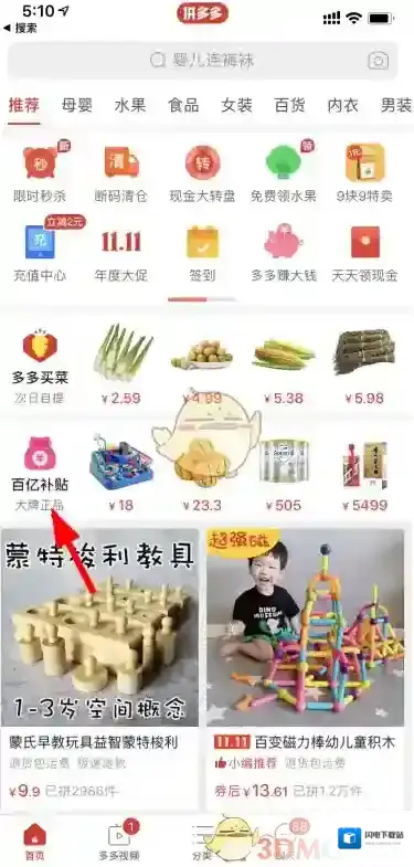 1、打开拼多多APP,在首页的部位点击百亿补贴进入;