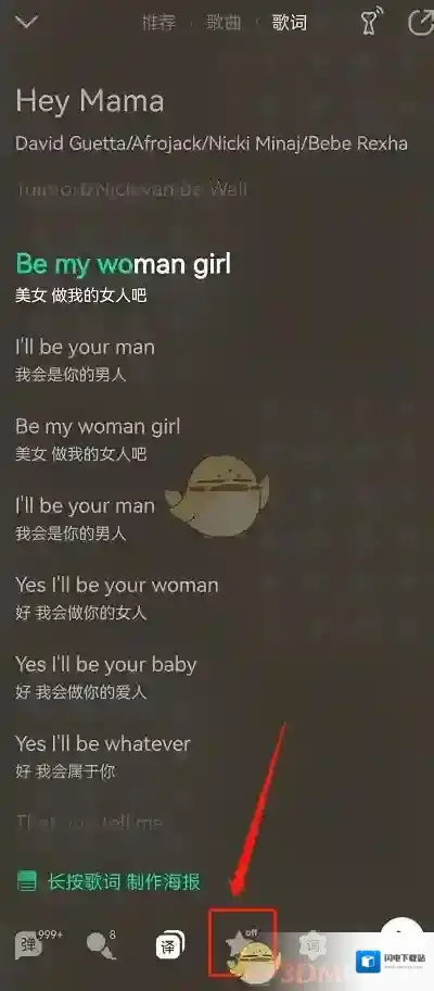 2、进入歌词页面后下方会有一些功能条,点击星星图案。
