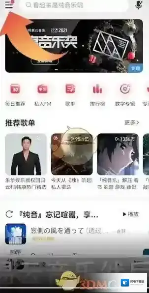 1、打开网易云音乐然后点击左上角三个横杠打开隐藏界面。