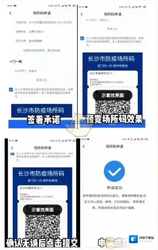选择“场所类型”,点击“场所名称”,输入场所名称,选择相应场所,输入入口名称,多个入口可点击“新增入口”新增,签署承诺,预览场所码效果,确认无误后点击提交,申请成功。