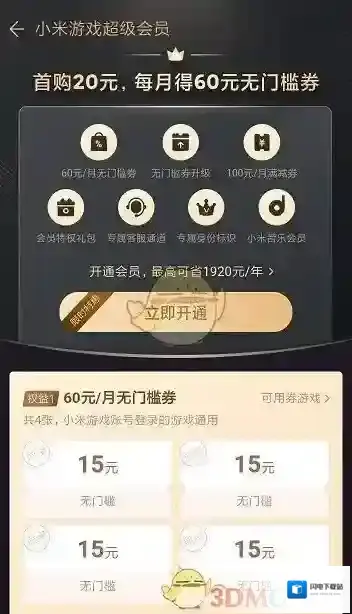 2、点开“小米游戏超级会员”,我们看到如下图所示的界面,点击“立即开通”,就可以正式成为超级会员啦!