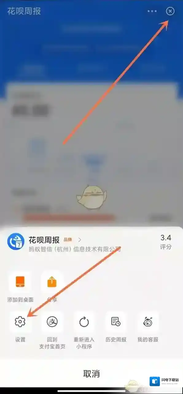 1、打开支付宝app,进入花呗周报界面,点击右上角三点,再点击设置。