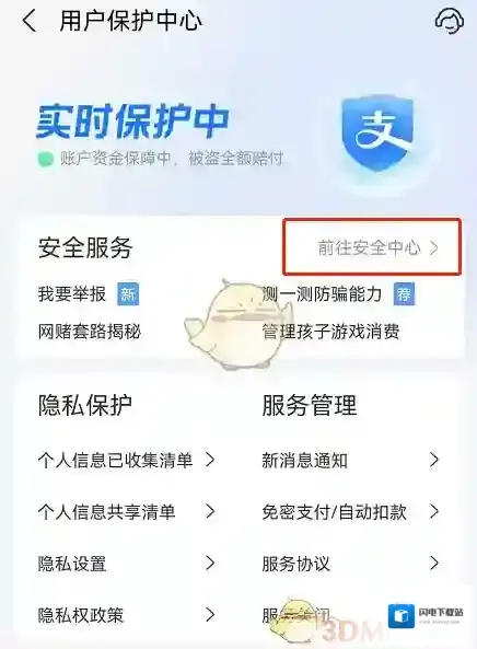 2、进入用户保护中心后点击“前往安全中心”