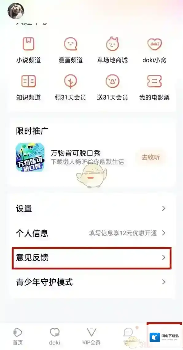 1、打开腾讯视频,点击个人中心里的意见反馈。