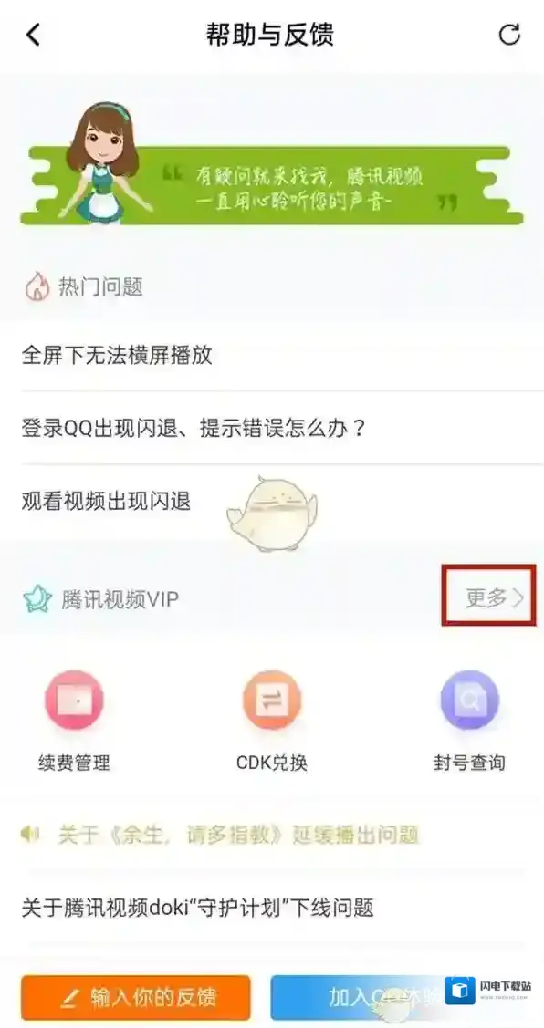 2、在帮助与反馈页面找到腾讯视频VIP,点击右侧更多。